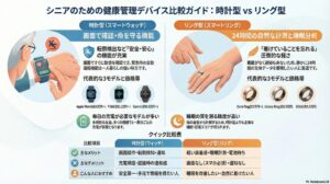 外出時は時計型、帰宅後や就寝時はリング型──という使い分けも賢い方法です。あるいは、右手にお気に入りのアナログ時計、左手の指にスマートリングで健康管理をする。そんなスタイルもシニア世代らしい粋な選択と言えるでしょう。