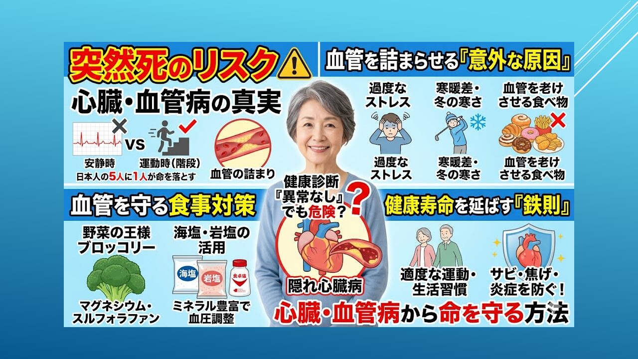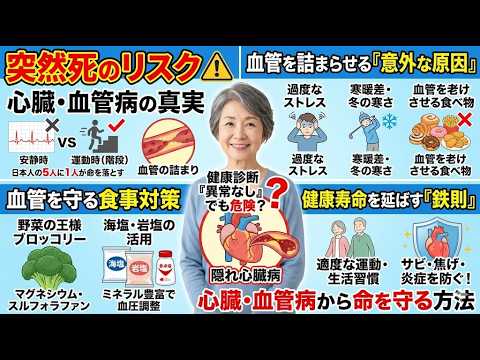この動画では、日本人の主な死因である心臓・血管疾患の危険性と予防策を詳しく解説しています。健康診断で異常がなくても、動脈硬化や突然死のリスクは潜んでいます。ストレス管理や寒暖差への注意が欠かせません。血管の老化を防ぐには、加工食品を避け、マ...