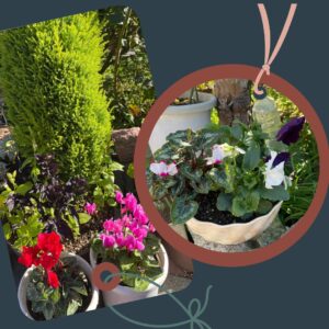 最もポピュラーな楽しみ方です。ガーデンシクラメンを主役に、ハボタン、ビオラ、パンジー、アリッサム、アイビー、シロタエギクなど冬に強い植物と組み合わせることで、冬の玄関を華やかに演出できます。