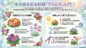 プリムラは、種類ごとの性質をつかみ、「冬は日当たり良く、霜と過湿を避けて管理」するだけで、長く色鮮やかな冬景色を楽しめます。