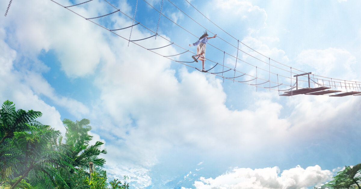 足元の隙間から谷底が見える吊り橋。一歩踏み出すと想像以上に揺れ、次の踏み板が遠く感じられます。緊張と興奮で鼓動が高鳴り、足が震えます。ロープをしっかりと握りしめながら、果たしてこの長い吊り橋を渡りきることができるでしょうか。