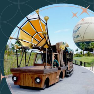 軽快な音楽に合わせてトラム(路面電車型の乗り物)で移動しながら、好きな楽器を叩いて楽しめます。15分おきに運行しているため、目的地が遠い場合や時間調整に便利です。楽器を叩いているうちに、あっという間に目的地へ到着しました。その後、パーク内を散策しました。