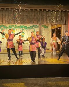 旅芸人「赤犬子」親子の案内で幻想的なプロジェクションマッピングを鑑賞。その後、吉を呼び込む獅子舞と組太鼓の演奏が披露されます。演出が素晴らしく、語り部が演舞を見事に盛り上げていました。