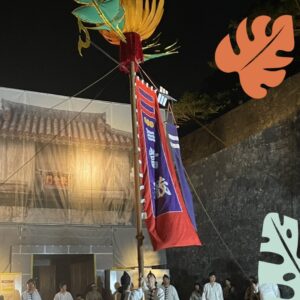 高さ約10m、重さ最大60kgの巨大な旗を、男衆が数人で持ち上げ、時より一人で鉦や太鼓に合わせて舞わせます。ライトアップされた城壁を背に躍動する姿は荘厳かつ勇壮で、琉球の魂が宿る美しい光景でした。