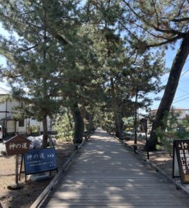 今回は、三保松原入口バス停から、縁結びやパワースポットとして知られる御穂(みほ)神社へ向かい、そこから樹齢数百年の松並木が続く木道「神の道」を歩くルートにしました。