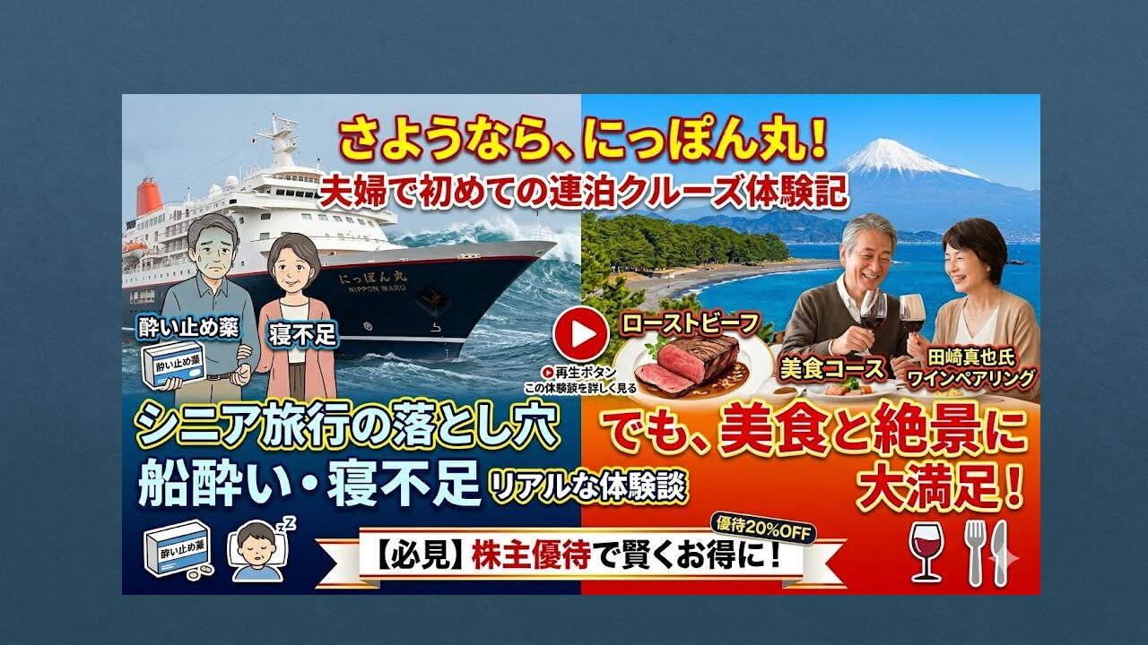 前編では、株主優待を活用して「にっぽん丸」の旅を予約するまでの流れを軸に、船内で味わった美食の魅力、そして初日から直面した船酔いという“現実”まで、読者の期待感を高めつつ描いてきました。