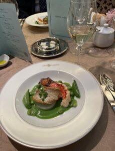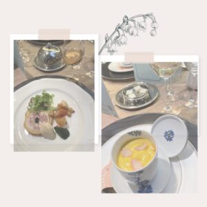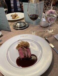 船内での豪華な食事と、田崎真也氏監修のワインペアリングが見事に調和していました。この日は、各コース料理に合わせてワインが丁寧にペアリングされています。