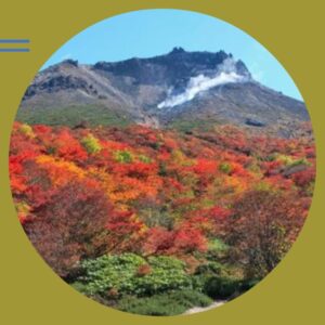 標高が高いため、例年9月下旬から10月中旬には早くも見頃を迎えます。火山特有の荒々しい山肌に、ドウダンツツジやナナカマドなどの高山植物や低木が鮮やかな赤や黄色に色づき、ダイナミックな山岳紅葉のモザイク模様を生み出します。